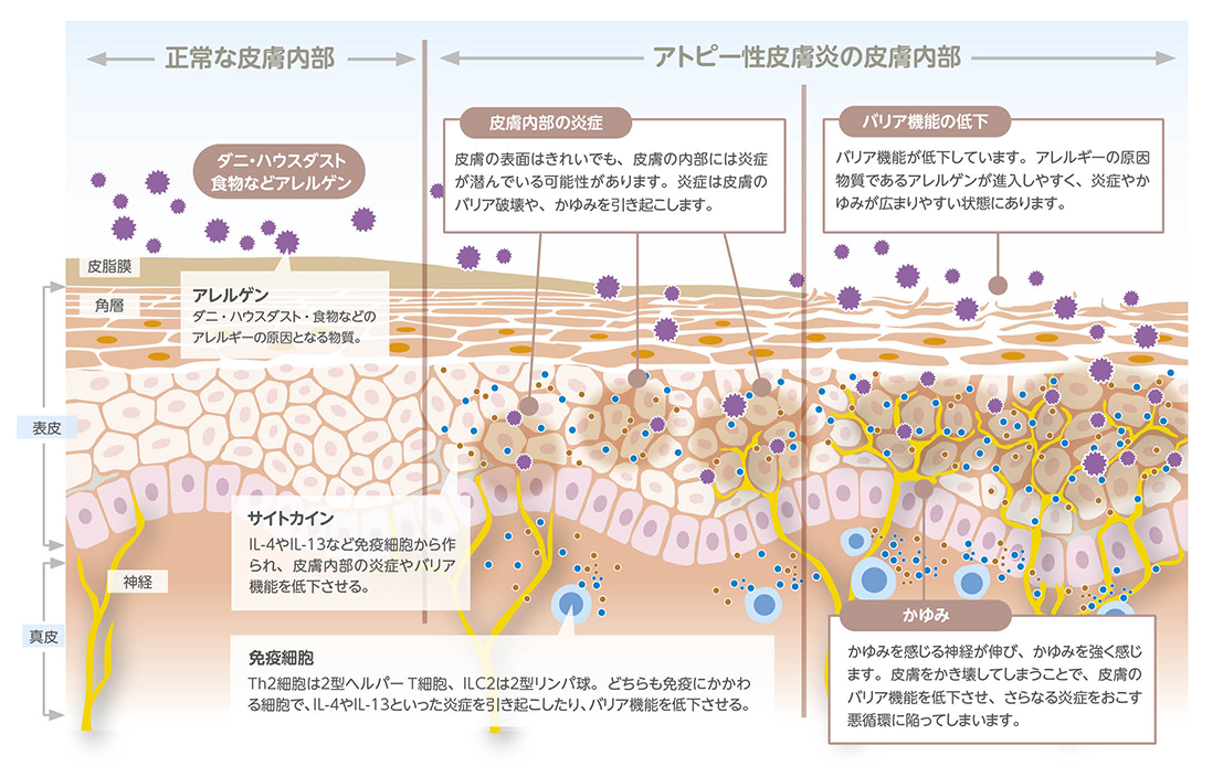 侵入した刺激に対して、免疫系が過剰に反応します。特に、ヘルパーT細胞(Th2)などが産生するインターロイキン-4(IL-4)やインターロイキン-13(IL-13)といったサイトカインが主導する「2型炎症」が、アトピー性皮膚炎の炎症の中核をなしています。これらのサイトカインは炎症を悪化させるだけでなく、皮膚バリア機能をさらに低下させ、悪循環を生み出します。2-3 かゆみの悪循環(イッチ・スクラッチサイクル)