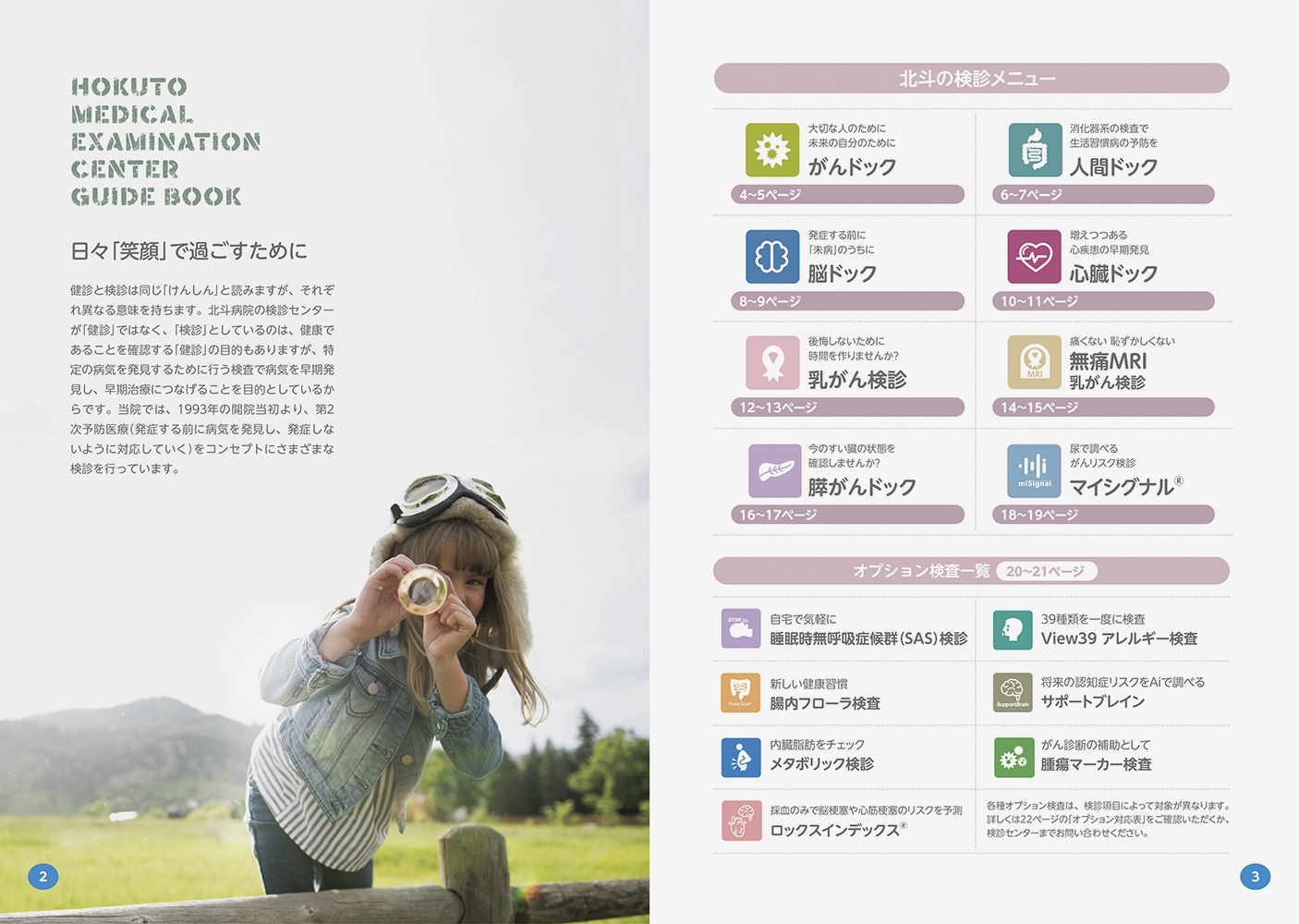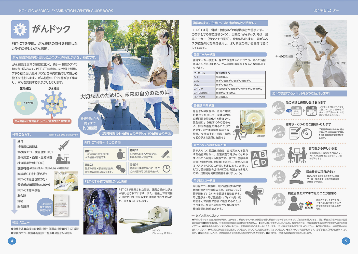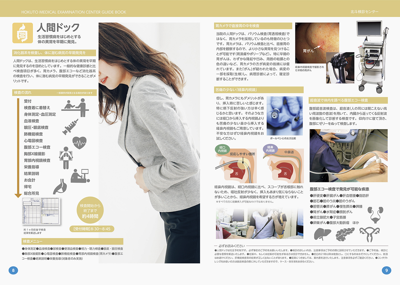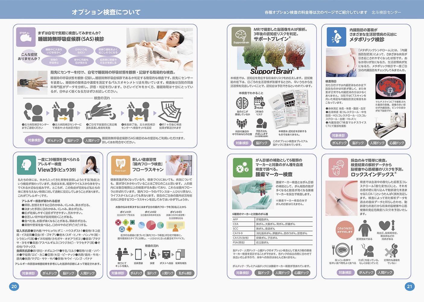 健診と検診は同じ「けんしん」と読みますが、それぞれ異なる意味を持ちます。北斗病院の検診センターが「健診」ではなく、「検診」としているのは、健康であることを確認する「健診」の目的もありますが、特定の病気を発見するために行う検査で病気を早期発見し、早期治療につなげることを目的としているからです。当院では、1993年の開院当初より、第2次予防医療(発症する前に病気を発見し、発症しないように対応していく)をコンセプトにさまざまな検診を行っています。掲載項目