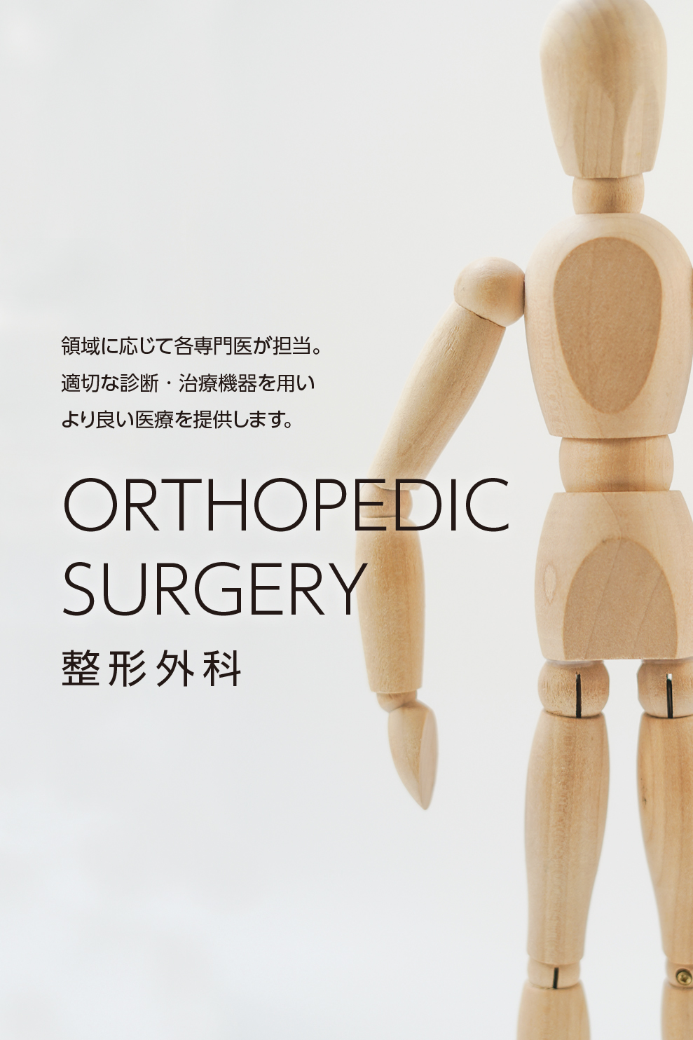 現在、日本は世界有数の長寿国となり、年々高齢化がすすみ、人生100年時代とよばれるほどになりました。一方で、加齢に伴う運動機能障害は、非常に重要な社会問題となっています。特に関節機能の低下は、体動・歩行困難を招き、著しくADL(日常生活動作)およびQOL(生活の質)を低下させます。当院整形外科では、膝・股関節センター、および肩関節センター・脊椎センターを併設し、関節疾患全般にわたって、積極的に治療に取り組んでいます。上肢・下肢・脊椎・外傷など、各専門医を中心に担当します。最新の検査機器を用いて迅速に診断し、より良い医療の提供をめざしています。