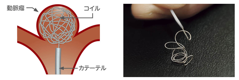 動脈瘤内にコイルを充填し破裂を防止。カテーテル術で使用されるコイル(右)