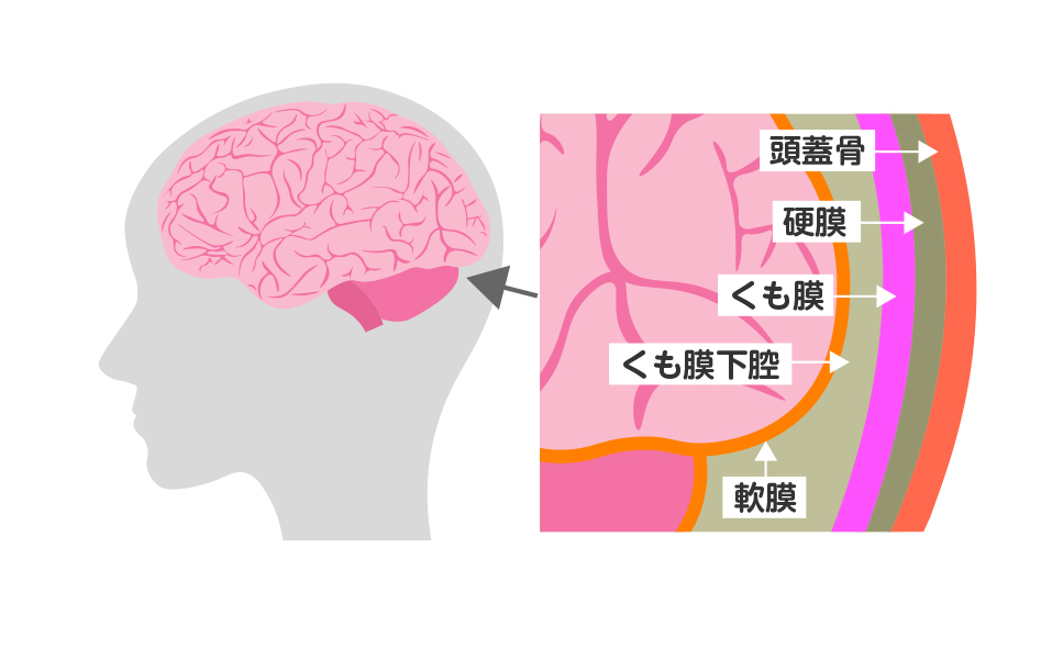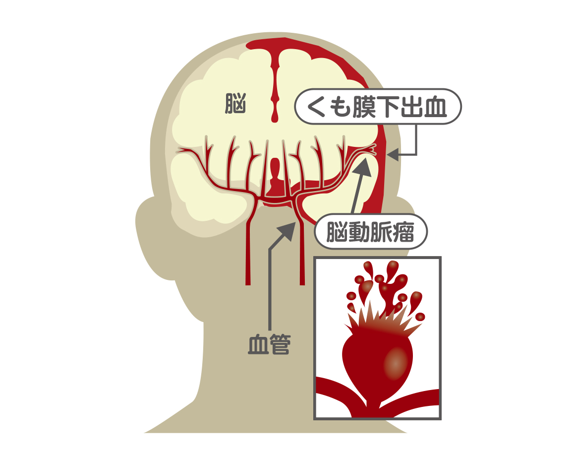 くも膜とは、脳脊髄を覆う3層の髄膜のうち、外から2層目にあたる膜のことを言い、くも膜下出血では、脳内の隙間を通り、脳に栄養を補給するための血管の分かれ目にできた脳動脈瘤が破裂、髄液で満たされたくも膜下腔内に出血が広がり、脳自体を圧迫し、激しい頭痛等の症状が起こります。