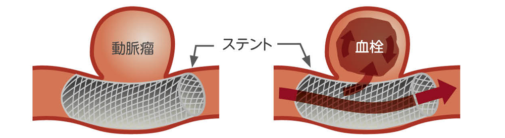 血管内にステントを留置し、動脈瘤内に流入する血液量が減少。血液を血栓化させることで破裂を防ぐ。
