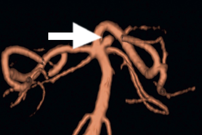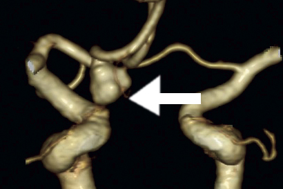 3テスラMRIで撮影した脳底動脈の動脈瘤。(矢印部分)