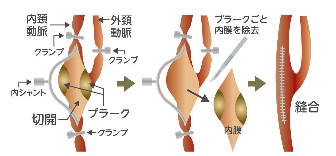 頚動脈内膜剥離は、頚部内頚動脈狭窄に対して行う治療法です。基本的には内科的治療が優先されますが、狭窄が強い場合やプラークが柔らかい(塞栓の原因となります)症例など、内科的治療で対応が困難な場合に、外科治療が必要となります。治療法は、頚動脈内膜剥離術と頚動脈ステント留置術があります。頚動脈内膜剥離術は、頚部を切開して頚動脈を露出し、血管を切開してプラークを摘除します。病変を直接処理してきれいにできる利点があり、特に柔らかく脆いプラークの場合は脳塞栓リスクの点で内膜剥離術の方が勧められます。