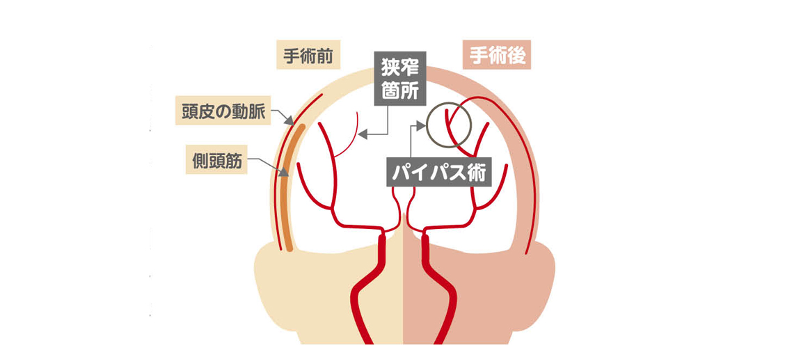 脳の太い血管が閉塞あるいは高度の狭窄を起こし、脳の血流が不十分となってしまった患者様が対象となる治療法です。その状態のままだと血流が不十分な部分が脳梗塞となり、麻痺や失語等の後遺症となってしまいます。バイパス手術をすることにより、脳の血流量を補い、脳梗塞を予防します。脳の血管がそのようになってしまうのは、動脈硬化による場合が多く、他にも「もやもや病」や「膠原病」などの血管炎による場合などがあります。手術は頭皮の血管(浅側頭動脈がよく用いられます)を脳表の血管につなぎます。慢性期に行うのが一般的ですが、脳梗塞が進行し症状が増悪していく症例には急性期にバイパス手術を行い、脳梗塞の進行を食い止めることができた症例もあります。