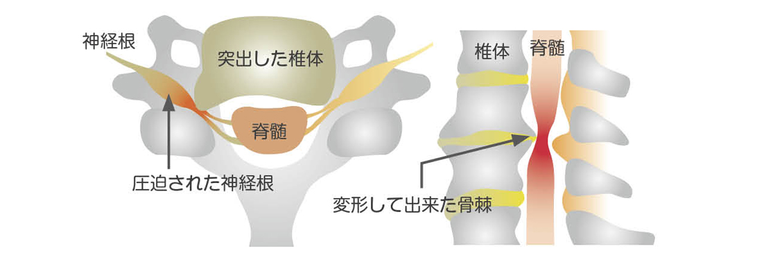 頚椎椎体の皮質骨が突出し、脊柱管や椎間孔が狭窄することにより、神経が圧迫されて、脊髄症や神経根症を引き起こします。神経を圧迫している狭窄成分を外科的に削除し、神経の正常な働きを回復させます。