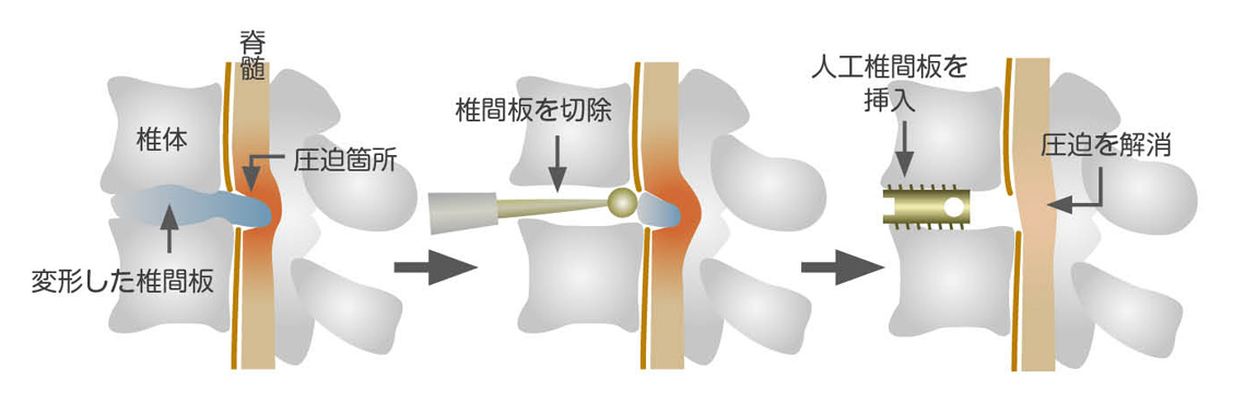 脊椎の椎体間の椎間板成分が突出してきている場合に、治療適応となります。頚椎では前方から椎間板を切除します。胸椎・腰椎では後方から椎弓を切除して、脊髄の横から椎間板を切除します。いずれも、人工椎間板(ケージ)を挿入して脊椎の安定性を確保します。