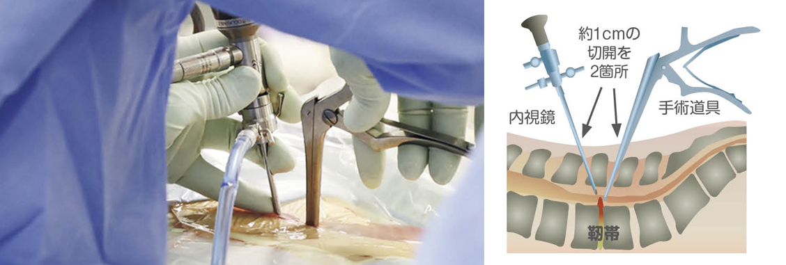 後縦靱帯や黄色靱帯が肥厚して脊髄を圧迫しています。頚椎後縦靱帯は前方から椎間板と肥厚した後縦靱帯を切除します。腰椎の場合は後方から椎弓を切除し、肥厚した黄色靱帯を切除します。いずれも、脊髄の周囲の空間を広げて、神経の除圧を図ることが目的です。