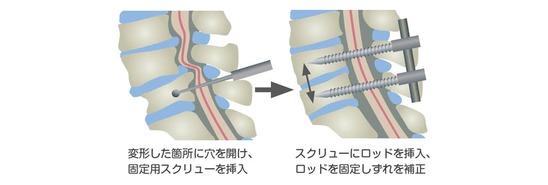 主に腰椎の椎体が上下でずれ、脊柱管が相対的に狭窄して腰髄を圧迫しています。椎弓を切除し脊椎のずれを補正するようにして、スクリューで固定します。