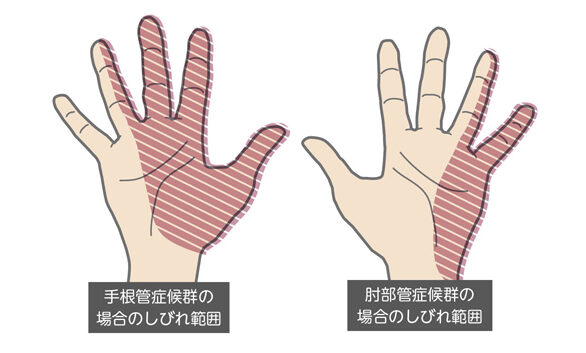 手の訴えの中で多い、手がしびれるといった場合は、まず手根管症候群か肘部管症候群を疑います。親指側がしびれる場合(厳密には親指から薬指の半分までの範囲)は手根管症候群の可能性を考え、原因となる正中神経の圧迫の程度を神経伝導速度検査で確認します。一方、小指側のしびれの場合は肘の内側で尺骨神経が圧迫される肘部管症候群の可能性を考えます。頸椎で神経が圧迫された場合でも手のしびれは起こりますので、鑑別が重要になります。また、手根管症候群の主な特徴として、40歳以上の中年女性に多く、夜中に痛みで目が覚める「夜間痛」があげられます。