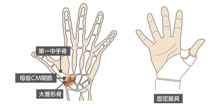 母指のつけ根の関節に起こる疾患が母指CM関節症です。軟骨がすり減って炎症を起こしていますから、最初の治療は痛い関節を安静にして痛みを減らす保存治療です。装具で親指から手首にかけて固定して親指の動きを制限することで炎症を減らすことができます。そのほかに飲み薬や関節注射などで治療を行っても改善がなければ手術を検討します。