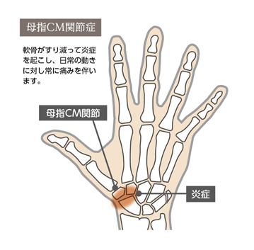 母指のつけ根の関節に起こる疾患が母指CM関節症です。軟骨がすり減って炎症を起こしていますから、最初の治療は痛い関節を安静にして痛みを減らす保存治療です。装具で親指から手首にかけて固定して親指の動きを制限することで炎症を減らすことができます。そのほかに飲み薬や関節注射などで治療を行っても改善がなければ手術を検討します。