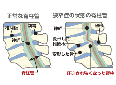 腰を使う作業や肥満などで腰椎に負担がかかり、靭帯が肥厚し神経が圧迫されることが原因として考えられています。