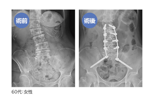 腰椎変性側弯症に対して矯正固定術を行った症例です。姿勢が良くなり、真直ぐ立てるようになって歩きやすくなりました。両足の痺れと痛みも取れて筋力も回復。更に身長が4cm程度伸びて嬉しいサプライズになったようです。