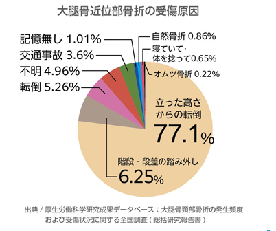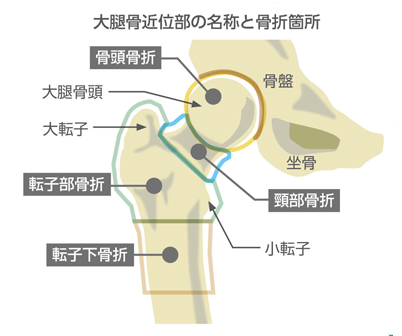 大腿骨近位部骨折とは、股関節に近い大腿骨の骨折のことを言い、大腿骨頚部骨折と大腿骨転子部骨折がほとんどを占め、国内で年間約17万件発生、そのうち約8割の13万件は女性で高齢者、とりわけ骨粗鬆症を発症している方に多い傾向にあります。