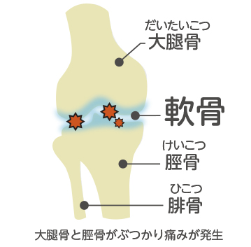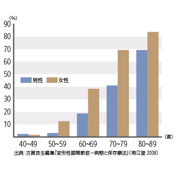 加齢、体重増加、仕事、外傷歴などが原因でひざの軟骨が少しずつ減少して変形したり、骨がこすれて痛みが起こる病気です。放置すると正座や階段の昇り降りが困難になり、やがて安静時にも痛み、歩くことも困難になってしまいます。日本での患者数は約3千万人で全人口の25%にも及ぶと推定される変形性膝関節症は、40歳代より散見され加齢とともに増加し、80歳代では男性の70%、女性の80%以上が罹患すると言われています。