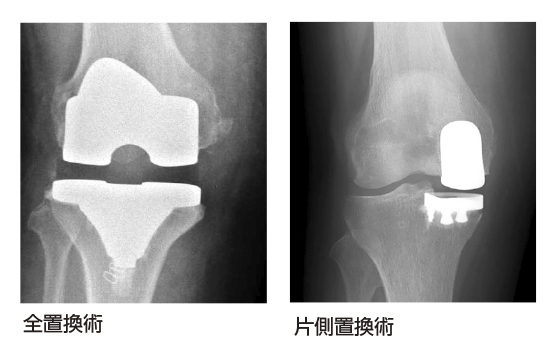 人工膝関節置換術は変形性膝関節症末期の高齢者に対して行う手術で、高齢者の増加と医療技術の進歩により、日本だけで年間8万件以上も行われています。大腿骨・脛骨の軟骨が摩耗・欠損し、軟骨下骨が露出してガタガタになった関節表面(荷重部)を削って、新しい人工の関節に置換する手術です。関節全部を置き換える全置換術と、関節の一部を置き換える片側置換術があります。