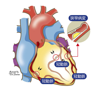 心臓は体中に血液を送り出すポンプの役目をしている臓器です。心臓は筋肉でできていますが、心臓の筋肉も血液から酸素をもらって活動しています。心臓の中には血液が常にあるのですが、残念ながら、心臓の中の血液から心臓の筋肉へ酸素を供給することはできません。心臓の出口のところに心臓の筋肉へ向かって血管が分岐しており、この血管からの血流で心臓は酸素が供給されます。この心臓の筋肉を栄養する血管を冠動脈と呼びます。狭心症は心臓の筋肉が必要なだけの酸素が供給されないため、酸欠状態になり、胸が苦しくなったりする病気のことをいいます。