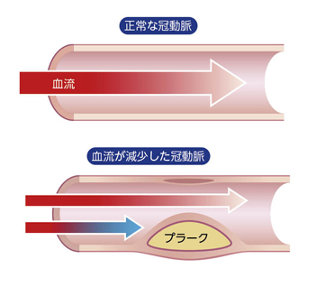 冠動脈は心臓の筋肉へ酸素等の栄養を供給している血管のことを言います。その血管内のいづれかに狭窄病変が発生した場合、心筋への栄養の供給が絶たれ、狭心症等の症状が起こります。正常な状態の冠動脈に対し、狭窄を起こした血管は、出来たプラークによって血流が減少。十分な酸素や栄養が行き渡りません。