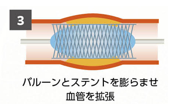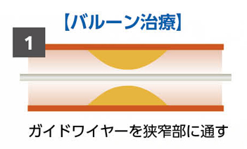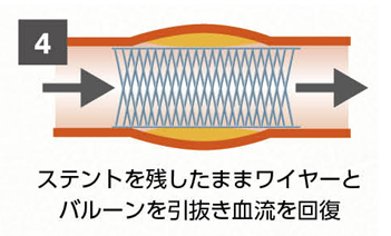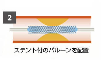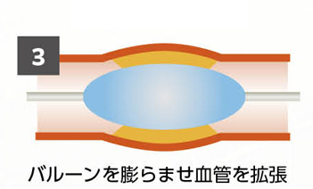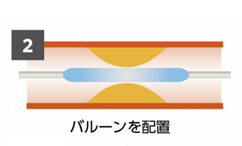 労作性狭心症の治療法で、比較的大きな血管に2~3カ所程度の狭搾の場合、カテーテル治療を検討します。手首、肘、足の付け根などから細い管を心臓の血管まで持って行き、カテーテルを用いて、ステントという金属やバルーンを用いて血管を広げる治療法です。