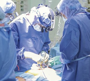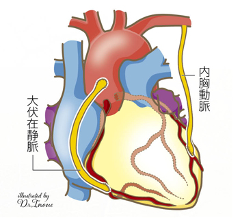 外科的治療法としては冠動脈バイパス手術を行います。自身の血管を採取し、全身麻酔で行います。狭くなった冠動脈の先に、髪の毛ほどの細い糸で血管を縫い付け、新しい迂回路(バイパス)を確保し血流を回復させます。糖尿病患者さんの複数の冠動脈病変に対してはこのバイパス手術が選択されます。