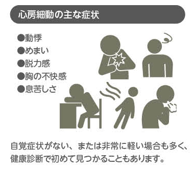 正常な心臓は、心臓内で発生する電気信号によって規則正しい収縮と拡張(拍動)を繰り返しています。心房細動とは、心房と呼ばれる心臓内の部屋が小刻みに震えて痙攣し、うまくはたらかなくなってしまう心臓の病気(不整脈の一種)のことをいいます。心房細動にかかると、動悸、めまい、脱力感、胸の不快感、息苦しさといった症状が出ることがありますが、その一方で自覚症状のない方もいらっしゃいます。