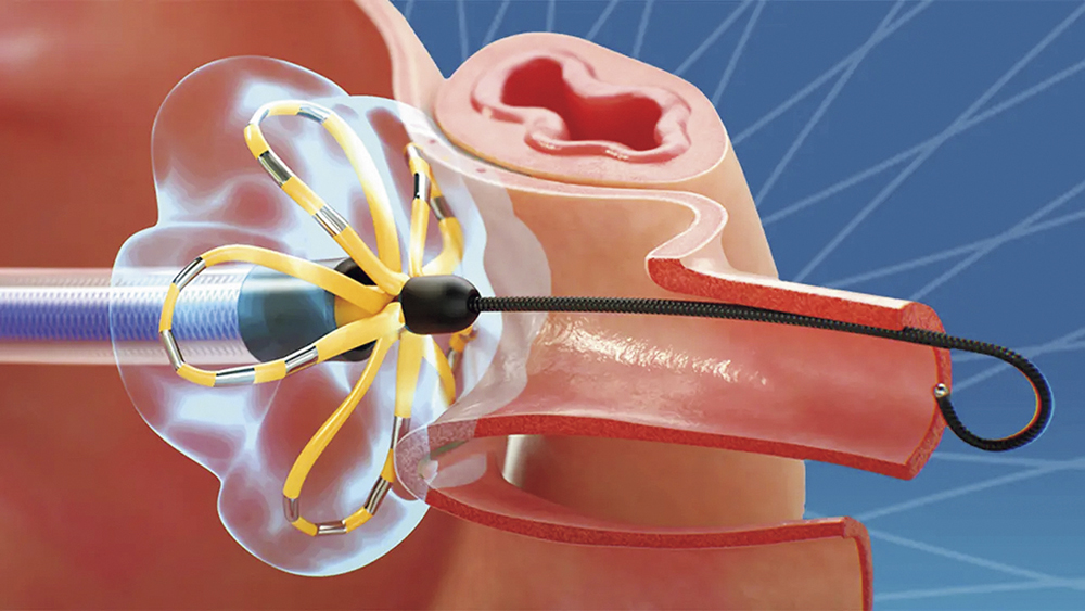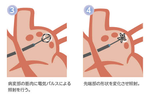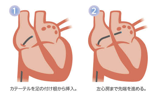 足の付け根の血管からカテーテルと呼ばれる細い管を挿入し、心臓内部まで誘導。その後心臓内の電気信号をマッピングする技術を使い、不整脈の原因となっている心房組織を特定します。カテーテルの先端から高電圧の電気パルスを数秒間照射することによって心筋細胞が死滅。異常な電気信号を生み出す細胞がなくなることで、心房細動を改善させます。