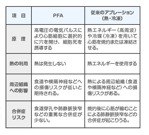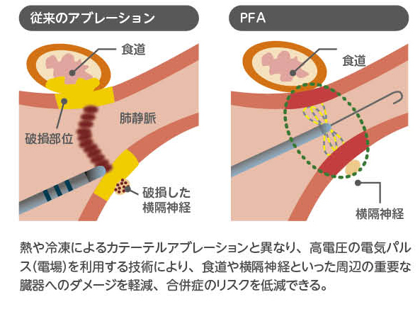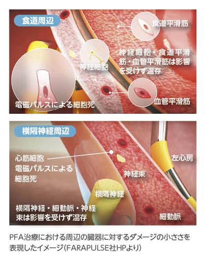心臓の筋肉以外にはほとんどダメージを与えないため、従来の合併症(食道損傷、横隔神経麻痺、肺静脈狭窄など)のリスクが大幅に減少すると期待されています。