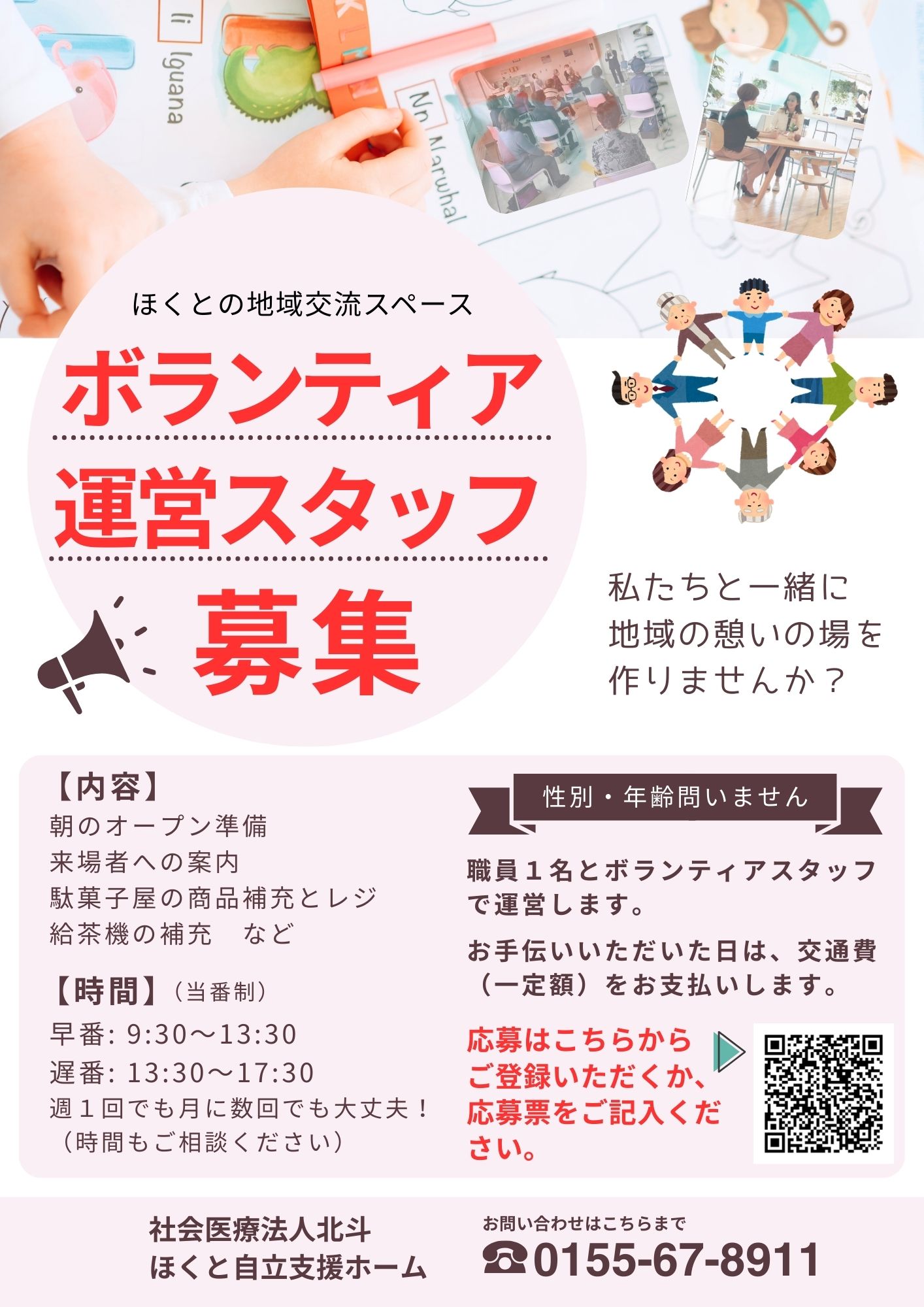 5月のオープンを目指して社会医療法人北斗がほくと自立支援ホーム(西18条南4丁目15ー10)1階に整備を進めている「共生型地域福祉拠点」では運営のお手伝いをいただけるボランティアスタッフを募集しています。