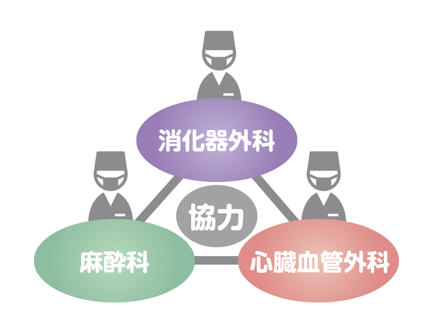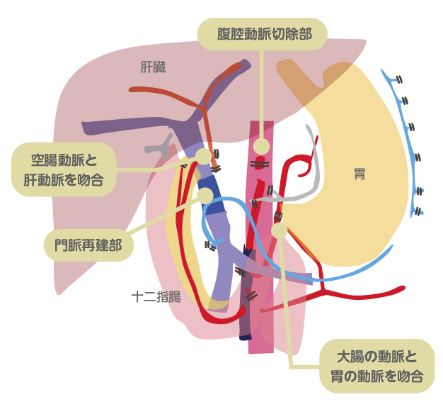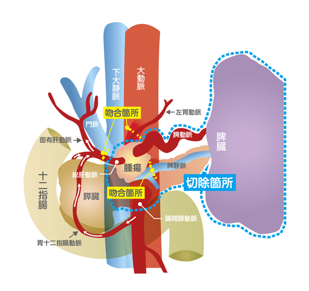 膵臓は周囲に重要な血管が多く、がんの進行とともに腫瘍が重要な血管を巻き込んでしまうことも少なくありません。このような場合、手術は難しいと判断して薬物治療や放射線治療を行う医療機関もありますが、当院では膵臓の切除とともに血管合併切除再建術を用い、可能な限り手術でがんを根治させることを目指しています。