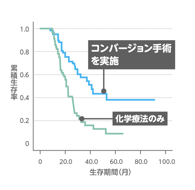 切除不能膵癌の治療は化学療法が主体となります。3種類の薬剤を投与するFOLFIRINOX療法やゲムシタビンとナブパクリタキセルの併用療法で、膵がんの治療成績は徐々に向上しています。化学療法の効果があれば1年前後の予後延長が期待できますが、良く効いた場合(奏功例)でも手足の痺れや骨髄抑制で治療の継続は2年ほどが限界とされます。最近は奏功例に手術を行うコンバージョン手術が期待されています。コンバージョン手術には下記の条件が必要です。